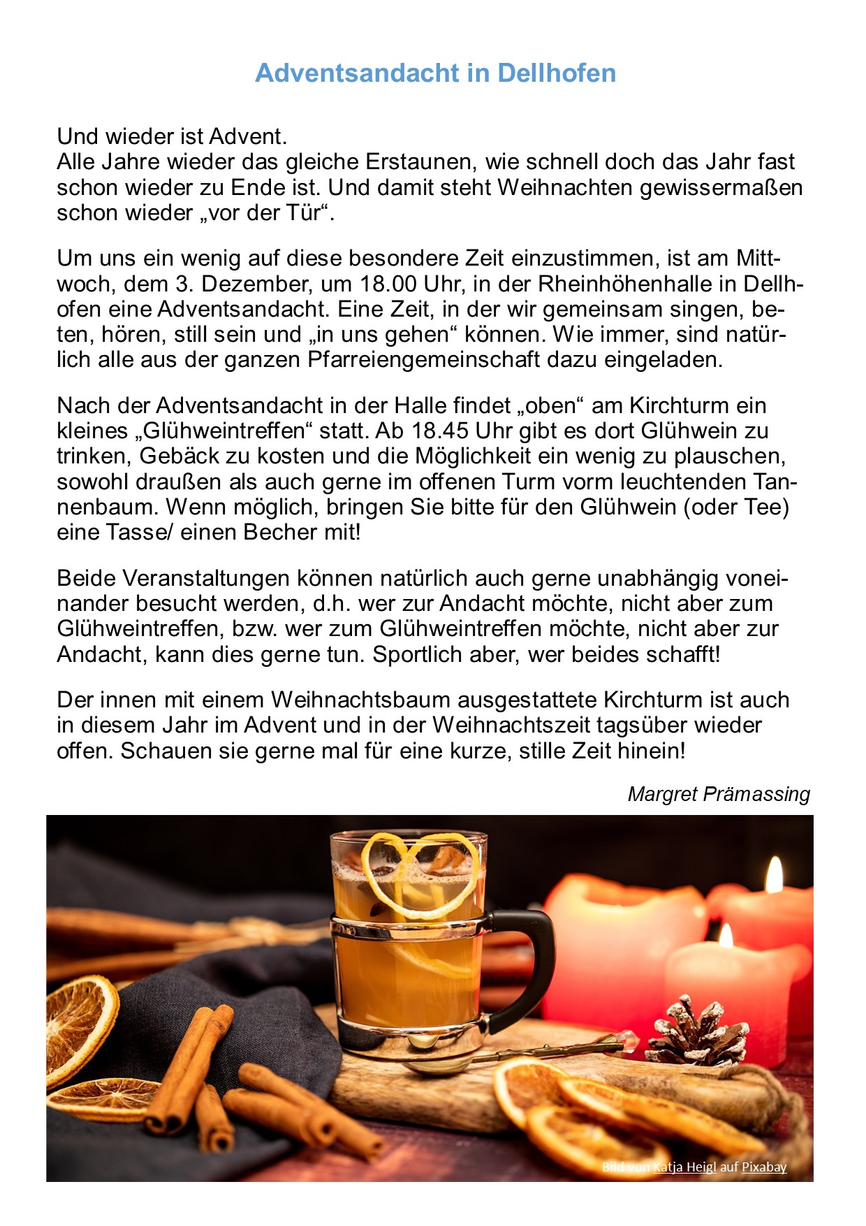 Adventsandacht in der Rheinhöhenhalle mit anschließendem Glühweintreffen am Kirchturm in Dellhofen.